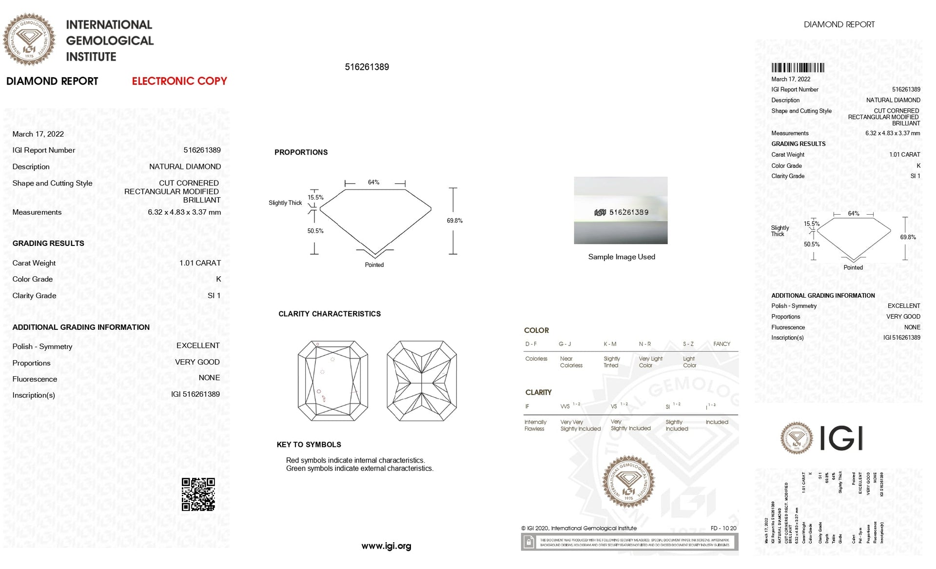 1.01ct Radiant Brilliant Cut SI1 Clarity K Color Natural Diamond