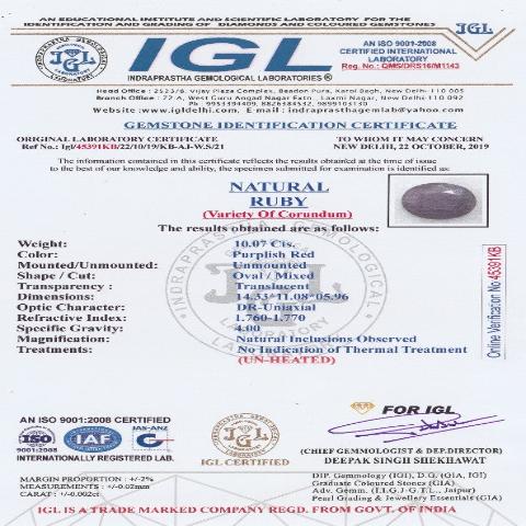 10.07 Carat 11.25 Ratti Natural IGL Certified Mozambique Oval shape Purplish-red Ruby Gemstone