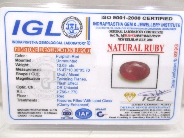 10.09 Carat 11.25 Ratti Natural IGL Certified Kazakhstan Oval shape Purplish-red Ruby Gemstone