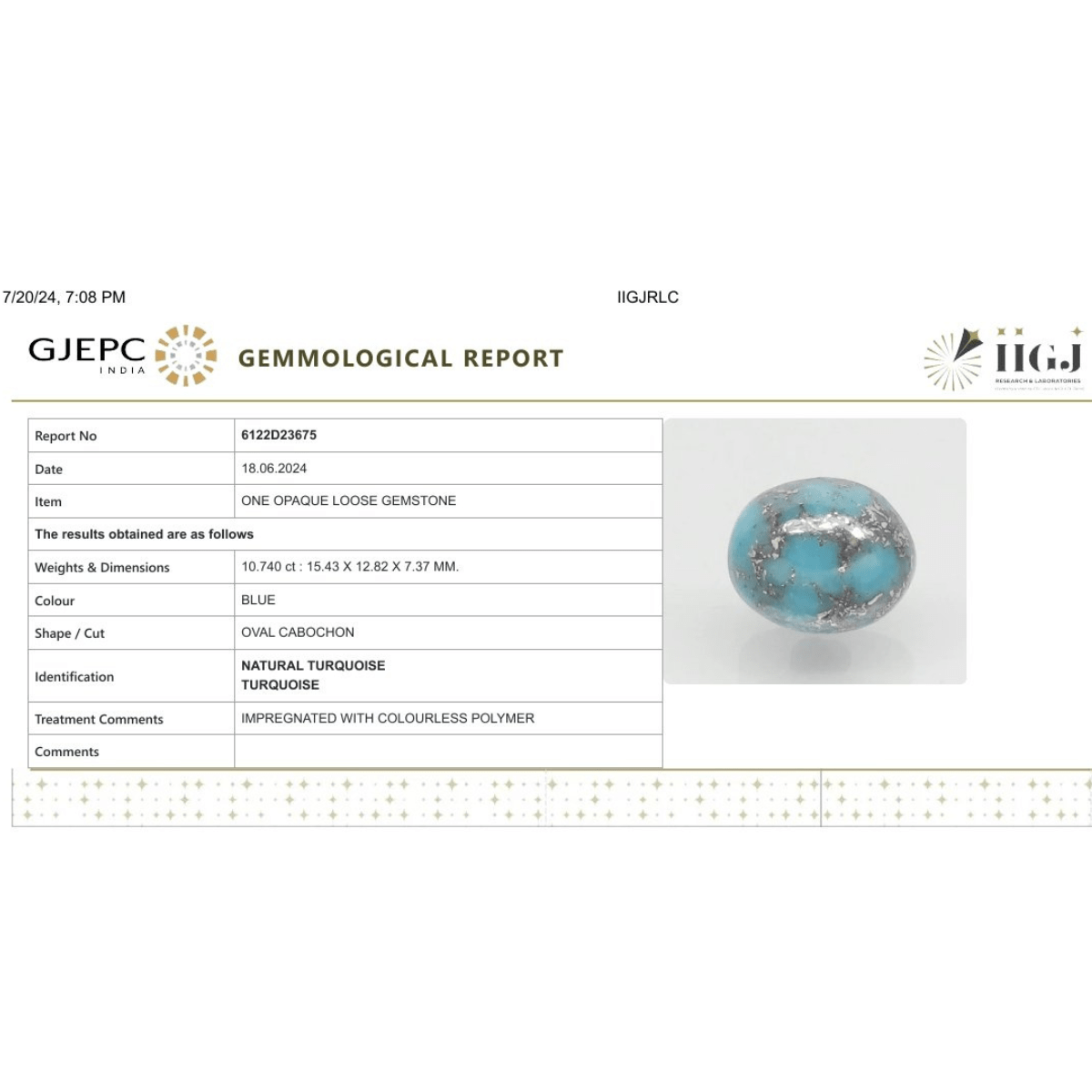 10.74 carat 12 ratti IGI-GTL certified AAA+ Quality Blue with golden Bisbee oval Turquoise (Firoza) Stone