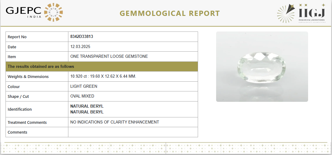 10.92 Carat 12.01 Ratti GII Certified Natural Brazil Oval Shape Light Green Beryl Stone