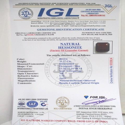 11.27 Carat 12.4 Ratti IGL Certified Natural Ceylon (Sri Lanka) Octagonal shape Hessonite (Gomed) Gemstone