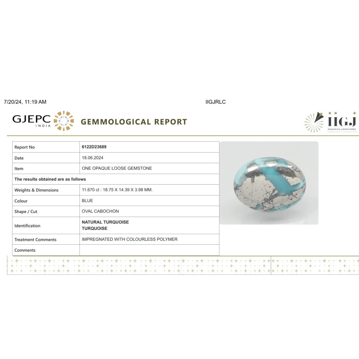 11.67 carat 13 ratti IGI-GTL certified AAA+ Quality Blue with golden Bisbee oval Turquoise (Firoza) Stone