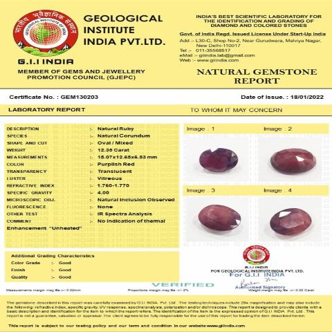 12.35 Carat 13.59 Ratti Natural GII Certified Mozambique Oval shape Purplish-red Ruby Gemstone