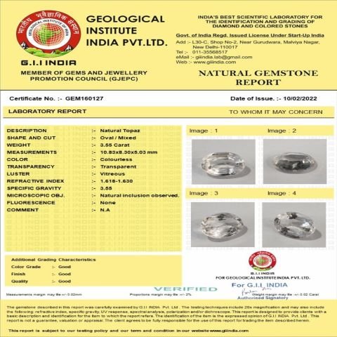 3.55 carat 4 ratti GII certified natural Indian oval shape white topaz stone