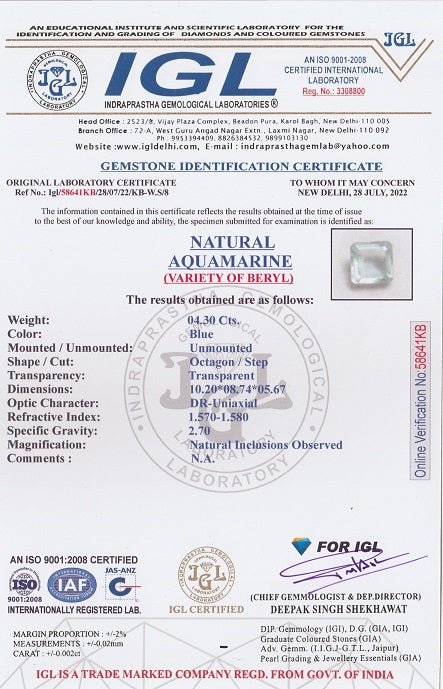 4.3 Carat 4.73 Ratti IGL Certified Natural Brazil Octagon Shape Blue Aquamarine Stone.