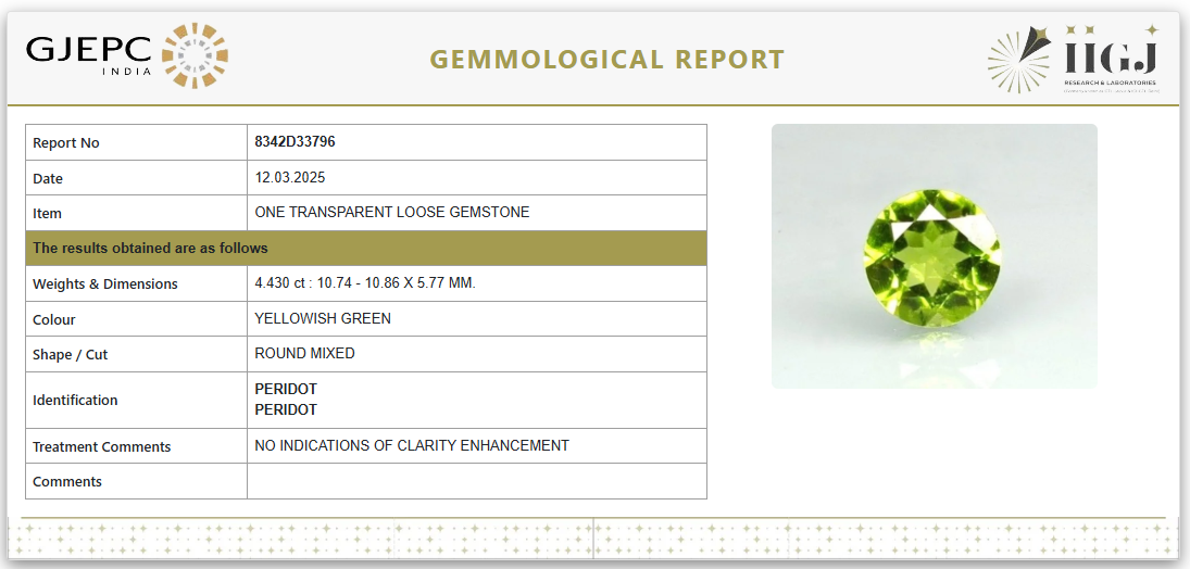 4.43 Carat 5.00 Ratti GII Certified Natural American Round Yellowish Green Peridot Stone