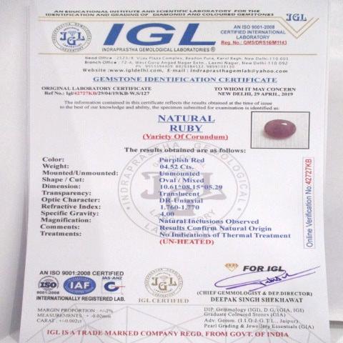 4.52 Carat 5 Ratti Natural IGL Certified Mozambique Oval Shape Purplish-red Ruby Gemstone