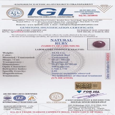 4.54 Carat 5 Ratti Natural IGL Certified Mozambique Oval shape Purplish-red Ruby Gemstone