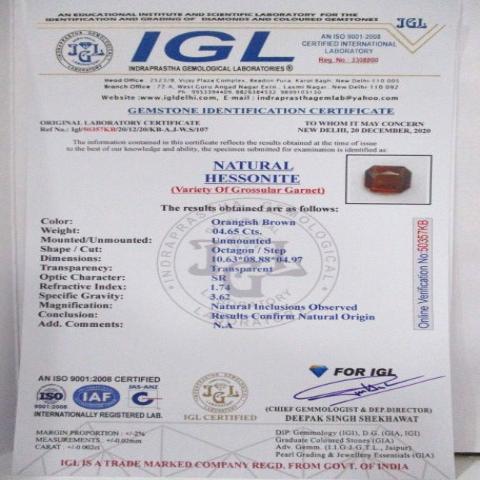 4.65 carat 5.25 ratti IGL certified natural African octagonal shape hessonite(gomed) stone
