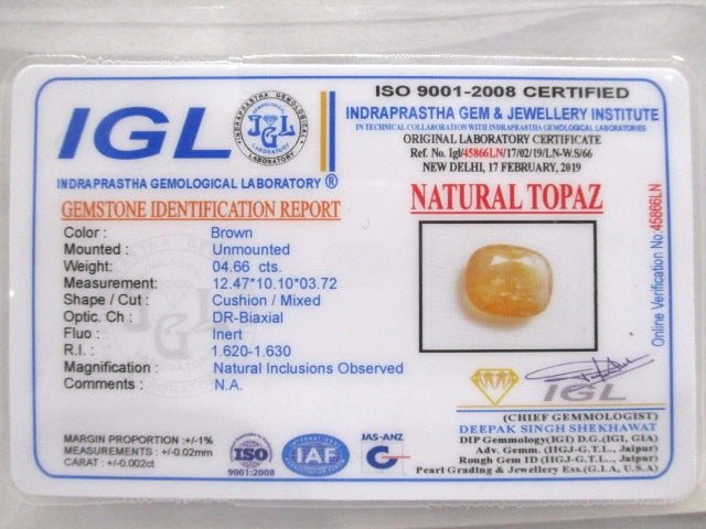 4.66 carat 5.25 ratti natural IGL certified Indian Cushion shape yellow topaz stone
