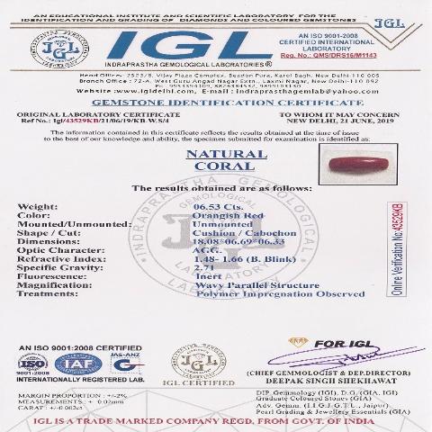 6.53 carat 7.25 ratti IGL certified natural Japanese cushion shape red coral stone