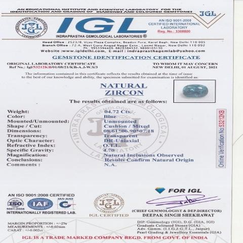 4.72 carat 5.25 ratti IGL certified natural Ceylon cushion shape blue Zircon stone.
