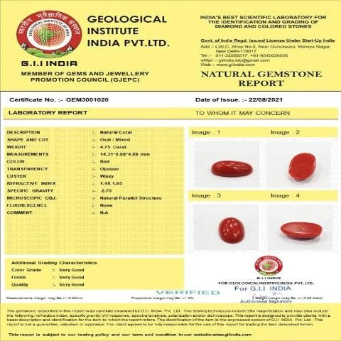 4.75 Carat 5.23 Ratti GII Certified Natural Japan Oval Shape Red Coral Stone