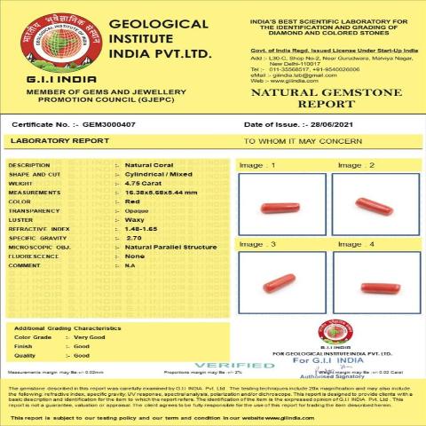 4.75 carat 5.23 ratti GII certified natural Italian cylindrical shape red coral stone