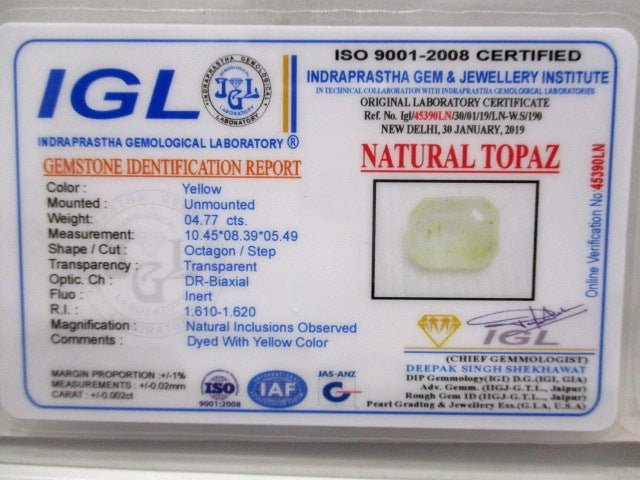 4.77 carat 5.25 ratti natural IGL certified Indian octagon shape yellow topaz stone