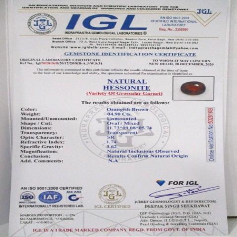 4.9 carat 5.39 ratti IGL certified natural ceylon(sri lanka) oval shape hessonite(gomed) stone