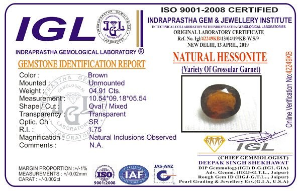 4.91 carat 5.4 ratti IGL certified natural ceylon(sri lanka) oval shape hessonite(Gomed) stone