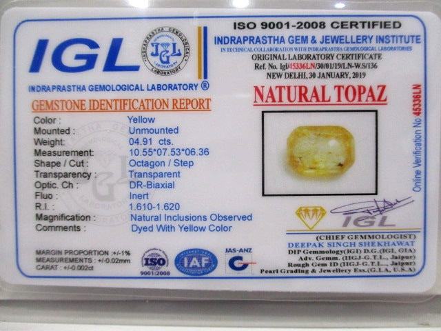 4.91 carat 5.4 ratti natural IGL certified Indian octagon shape yellow topaz stone