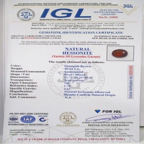 5.02 carat 5.52 ratti IGL certified natural ceylon oval shape hessonite(Gomed) stone