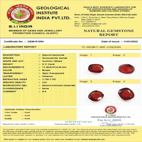 5.11 Carat (5.62 Ratti) Natural Ceylon Cushion Hessonite (Gomed) Gemstone