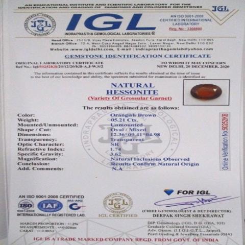 5.21 carat 5.73 ratti IGL certified natural African hessonite(gomed) stone