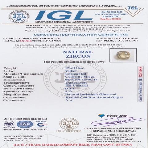 5.34 carat 6 ratti IGL certified natural Ceylon cushion shape yellow zircon stone