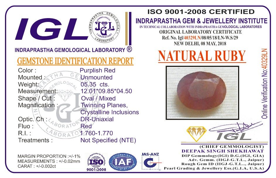 5.35 Carat 6 Ratti IGL certified Natural Africa Oval shape Purplish-red Ruby Gemstone