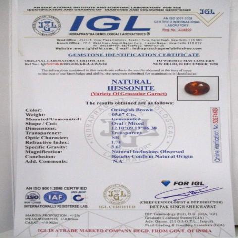 5.67 carat 6.23 ratti IGL certified natural African hessonite(gomed) stone