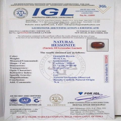 5.92 carat 6.51 ratti IGL certified natural ceylon(sri lanka) cushion shape hessonite(Gomed) stone