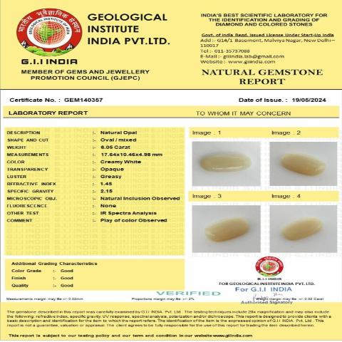 6.05 carat 6.66 ratti natural GII certified Australian Oval shape opal stone