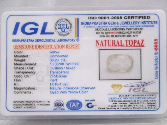 6.2 carat 7 ratti natural IGL certified Indian cushion shape yellow topaz stone