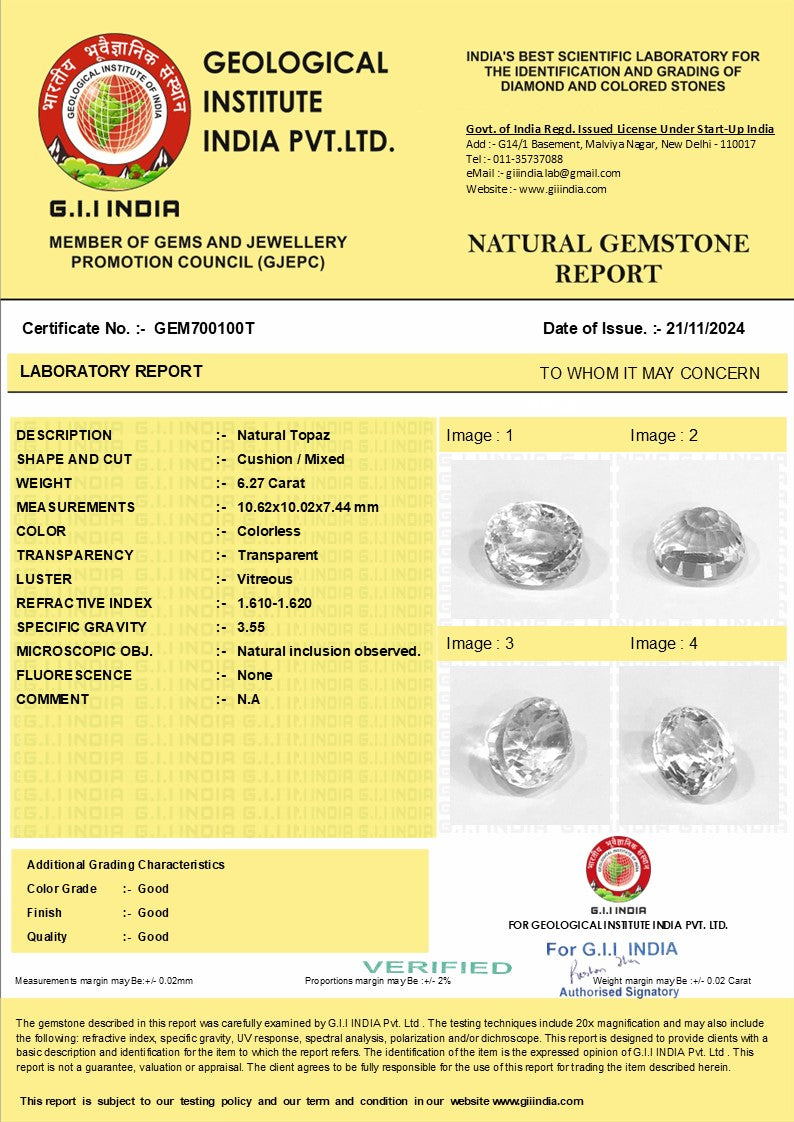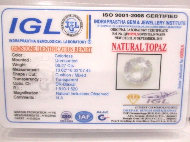 6.27 carat 7 ratti IGL certified natural Indian Cushion shape white topaz stone