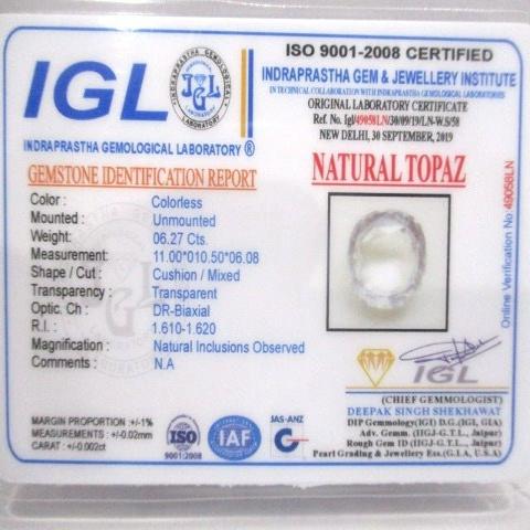 6.27 carat 7 ratti IGL certified natural Indian oval shape white topaz stone