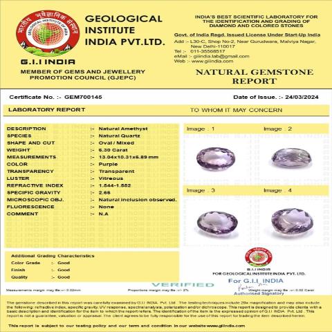 6.3 carat 7 ratti GII certified Natural American Oval Shape Amethyst Stone