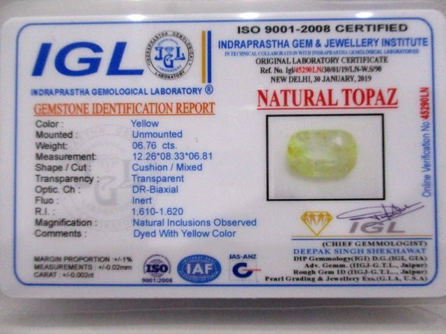 6.76 carat 7.44 ratti IGL certified natural Indian cushion shape yellow topaz stone