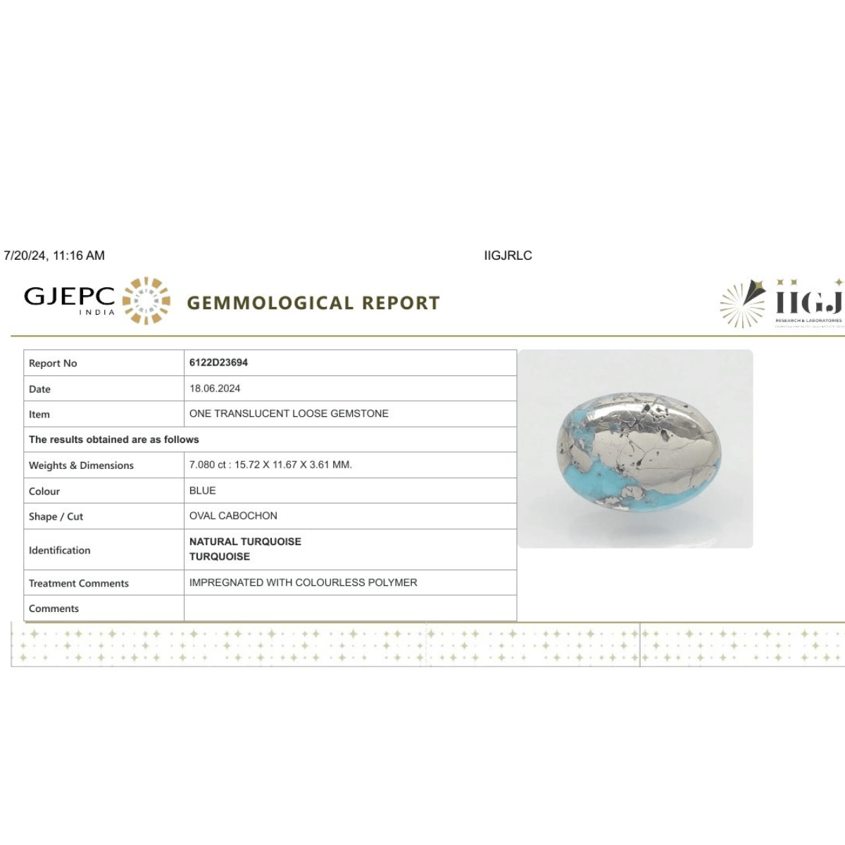 7.08 carat 8 ratti IGI-GTL certified AAA+ Quality Blue with golden Bisbee oval Turquoise (Firoza) Stone