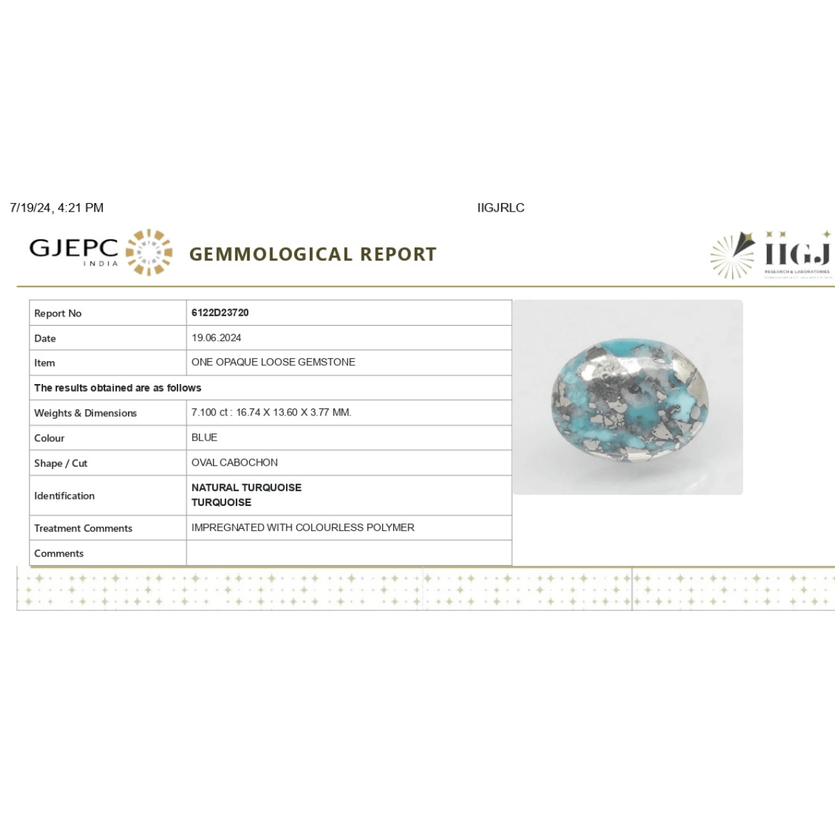 7.1 carat 8 ratti IGI-GTL certified AAA+ Quality Blue with golden Bisbee oval Turquoise (Firoza) Stone