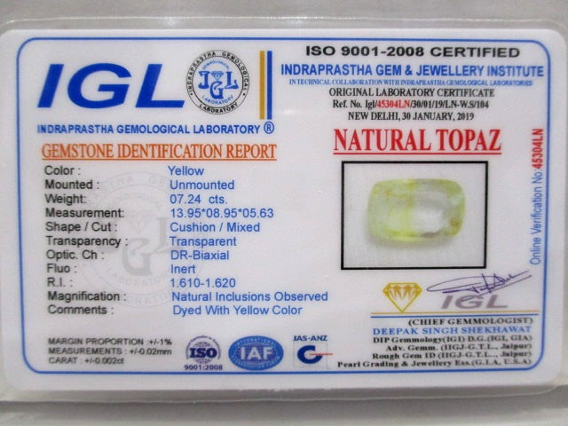 7.24 carat 8 ratti natural IGL certified Indian cushion shape yellow topaz stone