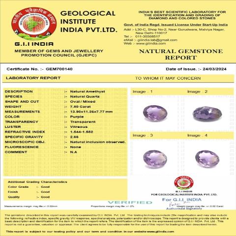 7.5 carat 8.25 ratti GII certified Natural American Oval Shape Amethyst Stone