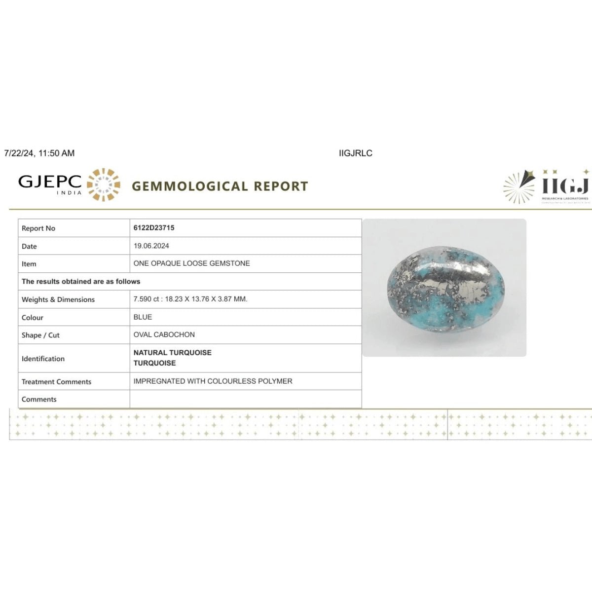 7.59 carat 8.35 ratti IGI-GTL certified AAA+ Quality Blue with golden Bisbee oval Turquoise (Firoza) Stone