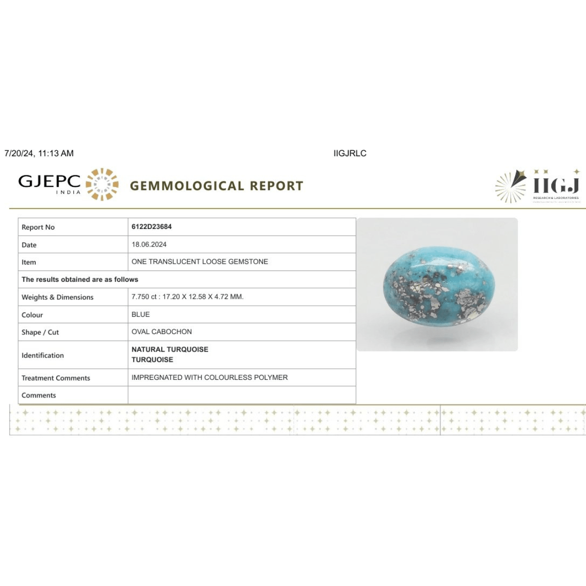 7.75 carat 8.53 ratti IGI-GTL certified AAA+ Quality Blue with golden Bisbee oval Turquoise (Firoza) Stone