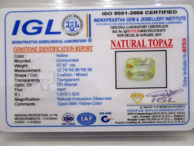 7.87 carat 8.66 ratti IGL certified natural Indian cushion shape yellow topaz stone