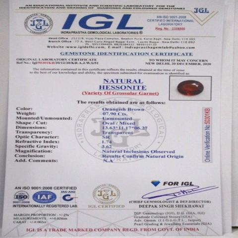 7.9 Carat (8.69 Ratti) IGL Certified Natural African Hessonite (Gomed) Gemstone