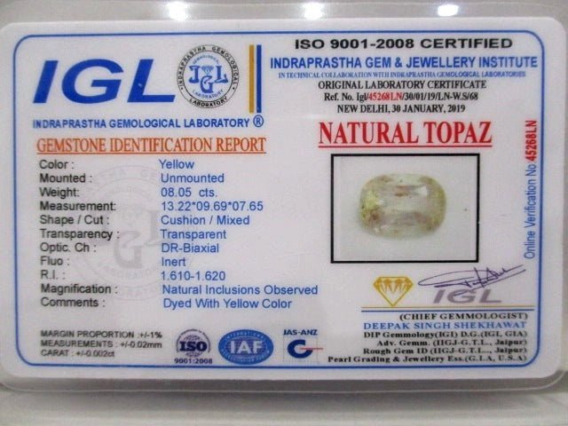 8.05 carat 9 ratti natural IGL certified Indian cushion shape yellow topaz stone
