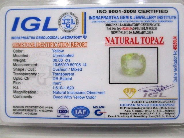 8.08 carat 9 ratti IGL certified natural Indian cushion shape yellow topaz stone