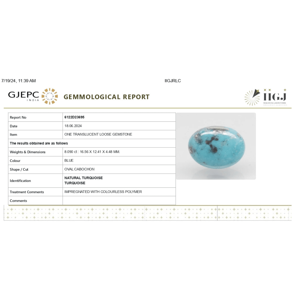 8.09 carat 9 ratti IGI-GTL certified AAA+ Quality Blue with golden Bisbee Turquoise (Firoza) Stone