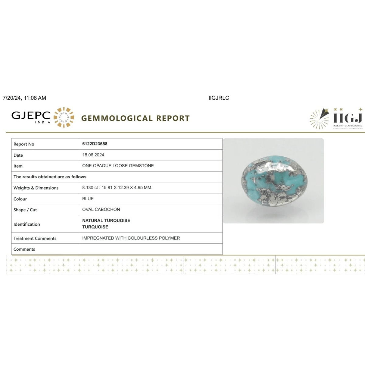 8.13 carat 9 ratti IGI-GTL certified AAA+ Quality Blue with golden Bisbee oval Turquoise (Firoza) Stone