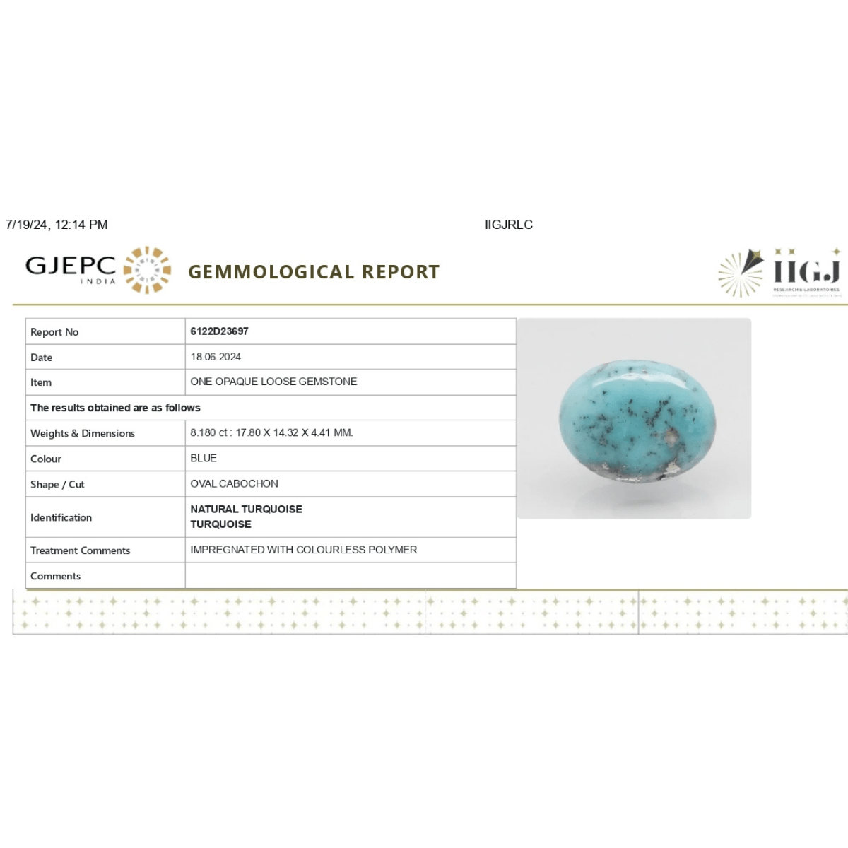 8.18 carat 9 ratti IGI-GTL certified AAA+ Quality Blue with golden Bisbee Turquoise (Firoza) Stone