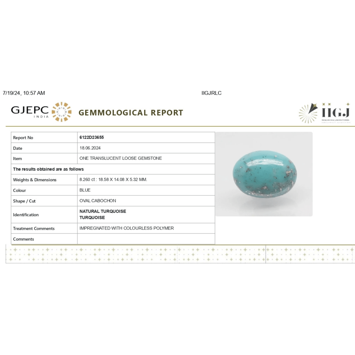 8.26 carat 9.25 ratti IGI-GTL certified AAA+ Quality Blue with golden Bisbee Turquoise (Firoza) Stone